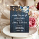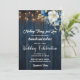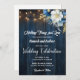 An elegant Wedding Invitation with elegant calligraphy completed by wonderful blue wood, garden string lights and white blue floral with gold glitter. You can personalise this card with your Wedding details.