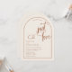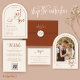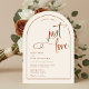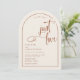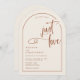 An elegant and modern earthy neutral arch-shaped wedding invitation that features minimalist text with a handwritten script accent in the phrase "nothing fancy just love." Shown on a cream background with terracotta text and design elements but all elements can be re-coloured to match your theme. © Kimbellished, LLC