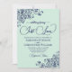 This beautiful wedding invitation is simple, modern, elegant, and fun. It features a beautiful mint green and navy blue design with lacy curls and swirls in the corners, and modern script lettering spelling out: Nothing Fancy, Just Love. Romantic, classy, and glam, yet whimsical and joyful, this wedding invitation is perfect for either a casual or formal ceremony.