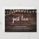 Beautiful Nothing Fancy, Just Love, Wedding Elopement Announcement / Invitation card, in Rustic farm dark wood background, String Lights design. This is perfect for your wedding reception and post-wedding celebration party.