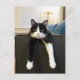 Hilarious picture of a black and white cat with front legs hanging over the side of the couch so all you see are the two legs and head.