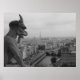 One of the iconic gargoyles of Notre Dame. He looks out over the city of Paris, the Eiffel Tower in the background.