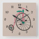 This cute novelty clock features an image of an old fashioned bicycle with a giant front tire. The image is in pink, teal green, and black, and placed on a light tan background. The black numbers make the clock easy to read. Fun, and kind of crazy! *This design uses artwork owned by Encore Software, Inc., which grants use to its licensors. All rights reserved.