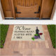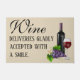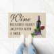Funny novelty doormat design for the wine drinkers. Design features a bottle of wine next to a wine glass with red wine in it. Along with the wine glass and wine bottle is a bunch of grapes. To the left of the wine bottle and glass is text in black font that says Wine deliveries gladly accepted with a smile. This funny and cute wine novelty design is perfect for the wine lovers home decor. Makes a great housewarming gift.