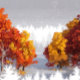 An autumn illustration of a vast white snowy background with the silhouettes of mountains and trees in the distance. The mountains and trees stretch far into the horizon, creating a serene and tranquil atmosphere. The ground is covered with vibrant orange and yellow leaves, adding a pop of color to the scene.