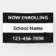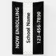 This school enrolment banner says 'Now Enrolling'. The text can be changed to show a custom message such as the school's name. Digits for your phone number are at the bottom.