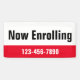 This outdoor banner is bright red, black, and white. You can edit the text to meet your needs. You can add your custom message (shown: Now Enrolling) and phone number. The top is white with black text. The bottom is bright red with white text for your phone number or custom text. All text can be edited or deleted.