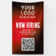 Now Hiring Banner with QR Code: Capture attention and streamline your hiring process with this eye-catching banner. Featuring the distinctive red grunge gradient background, this banner prominently displays your company's logo alongside a QR code that links directly to your online job listings. Ideal for job fairs, corporate events, or placement outside your business premises, this banner effectively communicates your hiring needs while reinforcing your brand identity.