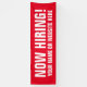 NOW HIRING big custom outdoor banner for business or company seeking personnel. Attach to fence, balcony or wall. Red or custom colour with bold typography. Custom outdoor and indoor signs for attracting staff, worker, coworkers, corporate colleagues etc. Help people find their job in your restaurant, shop, store, office, market and other places. Quick and easy templates for business owners. Enquire for all positions.