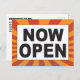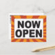 Now Open business advertising card features colourful orange and red sun rays in a retro pattern with bold attention-getting Now Open. Add your business information on the back and use to announce your presence to friends and community.