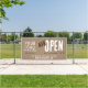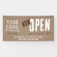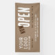 This rustic charm yet professional Now Open business banner features a simple, natural aesthetic kraft paper background with rough textured white typeface. Simply replace your logo and update your business information.