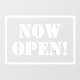 This "Now Open" Window Cling Graphic is bold enough to announce your business is trading. New company or new business notice. White on clear background.