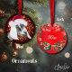 Hand painted portrait of this cute Nubian dairy goat in her Santa Hat - on a deep crimson red background with sparkling gold snowflakes. Goat Christmas ornaments for your Holiday gift giving, Christmas tree or window ornaments- customise the date on back