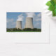 Twin cooling towers of a nuclear electric power utility plant belch white billowing clouds of steam into the blue skies of the rural countryside.