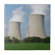 Twin cooling towers of a nuclear electric power utility plant belch white billowing clouds of steam into the blue skies of the rural countryside.