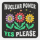 Cute smiling flowers with nuclear symbol and positive clean energy message. A cheerful retro inspired statement supporting nuclear power, sustainability and low emission electricity.