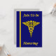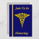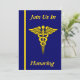 This blue and gold invitation is decorated on the front with a gold caduceus. You can customise this card by placing your information into the boxes provided.