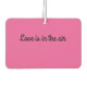 Back of freshener says love is in the air with pink background
