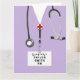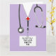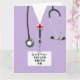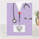 Creative nurse graduation card featuring lavender hospital scrubs. Edit text to add name and medical credentials.
