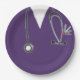 Unique nurse graduation party plates featuring purple nursing scrubs and a stethoscope illustration to add something special to any nurse's celebration party.