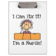 A great clipboard for nurses who love stick figures, features a female stick figure nurse with a giant size bandage and text that reads I Can Fix It! I'm a Nurse!