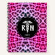 Designed with cool pink and purple leopard print background on both sides of notebook. The front has a white caduceus symbol and "RN" on the centre. Personalised with nurse's name.