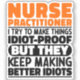 Funny Nurse Practitioner Sayings "Nurse Practitioner I Try To Make Things Idiot Proof But They Keep Making Better Idiots". Grab this Funny Nurse Practitioner design as a funny gifts for an awesome mum, dad or friend.