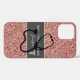 Protect your phone in style with this Nurse Practitioner Rose Gold Glitter Personalised iPhone 12 Case. It is designed with pink faux glitter background and grey horizontal stripe on the centre. A black stethoscope silhouette and white caduceus symbol with "nurse practitioner" is in white minimal print lettering. Name is in stylish white hand lettered script. CLICK "PERSONALIZE TEMPLATE" OPTION AND ENTER NAME.