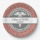Nurse RN Graduation Rose Gold Glitter Personalised Paper Plates are modern designed with pink rose gold faux glitter background horizontal stripe on the centre. Large white medical caduceus symbol is on grey circle with "congratulations registered nurse" curved around the symbol. Custom "class of" graduation year and personalised name is in grey block and calligraphy script lettering.