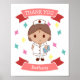 Cute Thank You poster for your favourite nurse. In the centre of the design is a cute nurse wearing a white uniform and nurses hat and carrying a blue medical file. Above her in a pink banner reads Thank You in white lettering. Below in another pink banner is a template to replace with your own name in white lettering. Behind her is colourful confetti floating around.