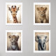 A grouping of four neutral-toned jungle animal nursery prints with editable captions. Beautiful as is or apply to a framed and matted fabric background to coordinate with your nursery decor.