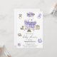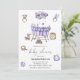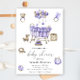 The invitation shows watercolor a baby cradle, a nursery mobile in the form of purple round clouds, children's toys: a rodent elephant, a duck on wheels, a teddy bear, a bunny, a bib, a pacifier, a pyramid.