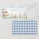 This diaper raffle enclosure card design features watercolor nursery rhyme themed clipart. This clipart includes mother goose, three blind mice, little bo peep, little boy blue, Humpty Dumpty, Miss Muffet, Cow and Moon, Dish and Spoon, Hickory Hickory, and Cat and the fiddle. The backside features a matching blue buffalo flannel pattern.