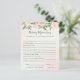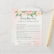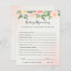 This baby shower game card features beautiful soft pastel watercolor roses and peonies in shades of blush pink and peach with lush green botanical leaves and eucalyptus.