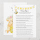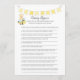 A fun game for the baby shower is the Nursery rhymes game. This game features a yellow banner at top and a teddy bear with a honey bee. On the reverse is a girl teddy bear leaning on a honey barrel watching a honey bee with templates.