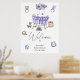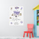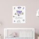 The invitation shows watercolor a baby cradle, a nursery mobile in the form of purple round clouds, children's toys: a rodent elephant, a duck on wheels, a teddy bear, a bunny, a bib, a pacifier, a pyramid.