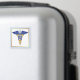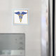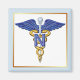 This Nursing Caduceus features golden snakes twined around a light blue staff with deeper blue upraised wings and large letter N.