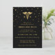 Classy gold & black nursing school graduation party invitations. Perfect for celebrating a new nurse! Sophisticated confetti and caduceus symbol with "RN" in a shimmery gold printed effect.