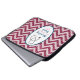 A laptop sleeve with a red chevron faux glitter pattern. Not actual glitter, just an image. Layered over top is an oval frame and inside is the saying: Nursing is a work of heart. Designed with a little pink heart and a grey stethescope.