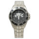 Has heft and feel of expensive stainless steel quartz watches. Good band with safety catch. I removed links, which is easy because engraved arrows show direction to push the linking pins. As always by this seller, the image (a railroad logo) is a perfect reproduction of my emailed image, and is precisely spaced and aligned.