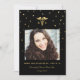 Black and gold nursing school graduation announcements with your own photo. A caduceus, 'RN', and confetti floats at the top of the announcement, with confetti overlaid on the photo. At the bottom you can personalise it with the new nurse's name, class year, and nursing school. On the back is a cute confetti, caduceus, and "congrats" pattern!