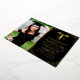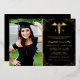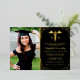 Elegant nursing graduation party invitations featuring a stylish black background that can be changed to any colour, a photo of the graduate, real gold foil glitter, the caduceus symbol, and a modern text template that is easy to personalise.