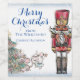 This colourful and festive custom wine bottle label features a Nutcracker winter fairy tale theme. A large image of a nutcracker dressed in red and gold in placed on the right. A cute little mouse king and mouse ballerina are pictured at the bottom decorating a Christmas tree. A banner of snow borders the top and bottom edges.
