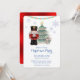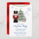 This colourful, elegant, and festive custom Christmas or holiday party invitation features a Nutcracker fairy tale theme. A large image of a nutcracker dressed in red and gold in placed on the left side of a beautifully decorated Christmas tree. A cute little mouse king is pictured to the right. Faux gold glitter accents the illustrated images and soft blue glitter snowflakes fall from the sky. A string of bright coloured lights accents the top.
