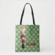 An adorable Holiday tote bag printed with a festive cartoon image of a traditional Nutcracker on a green background with a white snowflake background. There is a template you can personalise with your name to create a unique gift for a ballet lover or anyone who loves Christmas.