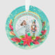 Description: Celebrate the magic of the holidays with this enchanting personalized Christmas ornament! Featuring a beautiful illustration of Clara from The Nutcracker ballet holding her beloved Nutcracker, alongside a festive Christmas tree and vibrant poinsettias, this ornament is a perfect keepsake. The front can be customized with a name (e.g., "Olivia as Clara") and the year, making it a truly unique memento. The reverse side carries a heartfelt "Merry Christmas! Wishing you a Happy and Healthy New Year. Love [Your Family Name]" message, surrounded by sparkling gold accents and a beautiful bokeh background. Crafted from a lovely teal and snowflake border, this ornament adds a touch of classic holiday charm to any tree. It's an ideal gift for ballet lovers, children, or families looking for a special way to commemorate the festive season.