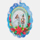 Description: Celebrate the magic of the holidays with this enchanting personalized Christmas ornament! Featuring a beautiful illustration of Clara from The Nutcracker ballet holding her beloved Nutcracker, alongside a festive Christmas tree and vibrant poinsettias, this ornament is a perfect keepsake. The front can be customized with a name (e.g., "Olivia as Clara") and the year, making it a truly unique memento. The reverse side carries a heartfelt "Merry Christmas! Wishing you a Happy and Healthy New Year. Love [Your Family Name]" message, surrounded by sparkling gold accents and a beautiful bokeh background. Crafted from a lovely teal and snowflake border, this ornament adds a touch of classic holiday charm to any tree. It's an ideal gift for ballet lovers, children, or families looking for a special way to commemorate the festive season.