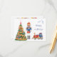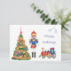 Christmas card for Kids. Nutcracker with drum next to a colourful Christmas tree and toy train.