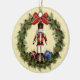 Beautiful red nutcracker doll in wreath round Fröhliche Weichnachten, German Christmas ornament. This lovely double sided holiday art ceramic ornament features a red nutcracker in the centre of a holiday wreath with pine cones and berries! The back also has a lovely wreath and bow with the words "Fröhliche Weichnachten" - Merry Christmas in German language, and the year! A wonderful addition to your ornament collection, holiday decor and a great gift for family, friends and someone who loves the nutcracker!