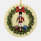 Beautiful red nutcracker doll in wreath round Joyeux Noël, French Christmas ornament. This lovely double sided holiday art ceramic ornament features a red nutcracker in the centre of a holiday wreath with pine cones and berries! The back also has a lovely wreath and bow with the words "Joyeux Noël" - Merry Christmas in French language, and the year! A wonderful addition to your ornament collection, holiday decor and a great gift for family, friends and someone who loves the nutcracker!